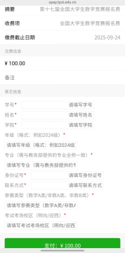 2、报名费:根据中国数学会《关于举办第十七届全国大学生数学竞赛的通知》文件:“每个参赛学生要向参赛单位交报名费100元。”经与山西数学会沟通,需竞赛组织单位统一代收后上交。