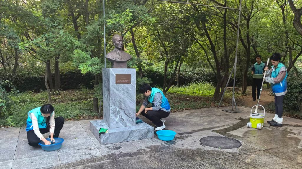 清洁工作首先聚焦于常师贞先生的铜像。作为永利集团精神的象征之一,铜像的洁净不仅关乎环境美观,更关乎一份深厚的情感寄托。志愿者们手持专用的清洁工具,小心翼翼地对铜像的各个立面、浮雕细节乃至基座文字进行了极为细致的擦拭。他们俯下身,踮起脚,不放过任何一处积尘与雨渍的痕迹,用细致的动作表达对常师贞先生的无限敬仰。在大家的共同努力下,历经风雨的铜像很快褪去了表面的蒙尘,重新焕发出温润而庄严的光泽,常先生睿智、坚毅的神情仿佛也更加清晰地呈现在大家面前。